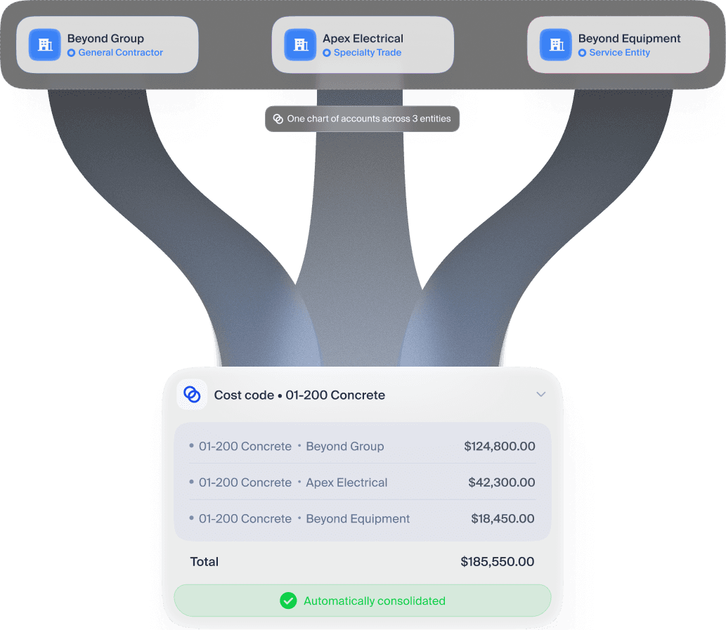 Unify financials across GCs, specialty trades, and service entities in one place. Post intercompany entries and eliminations in a single step. Organize subcontractors and trades with cost codes, not a bloated chart of accounts.