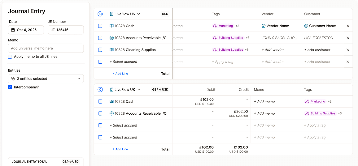 Flow handles every layer of multi-currency automatically. Revaluations post at period end, translation adjustments calculate on consolidation, and every report is viewable in your reporting currency or the local currency of each entity.