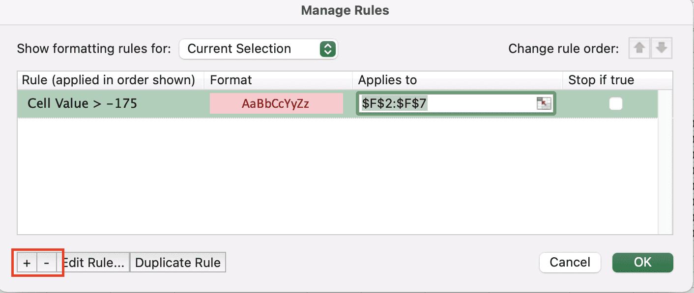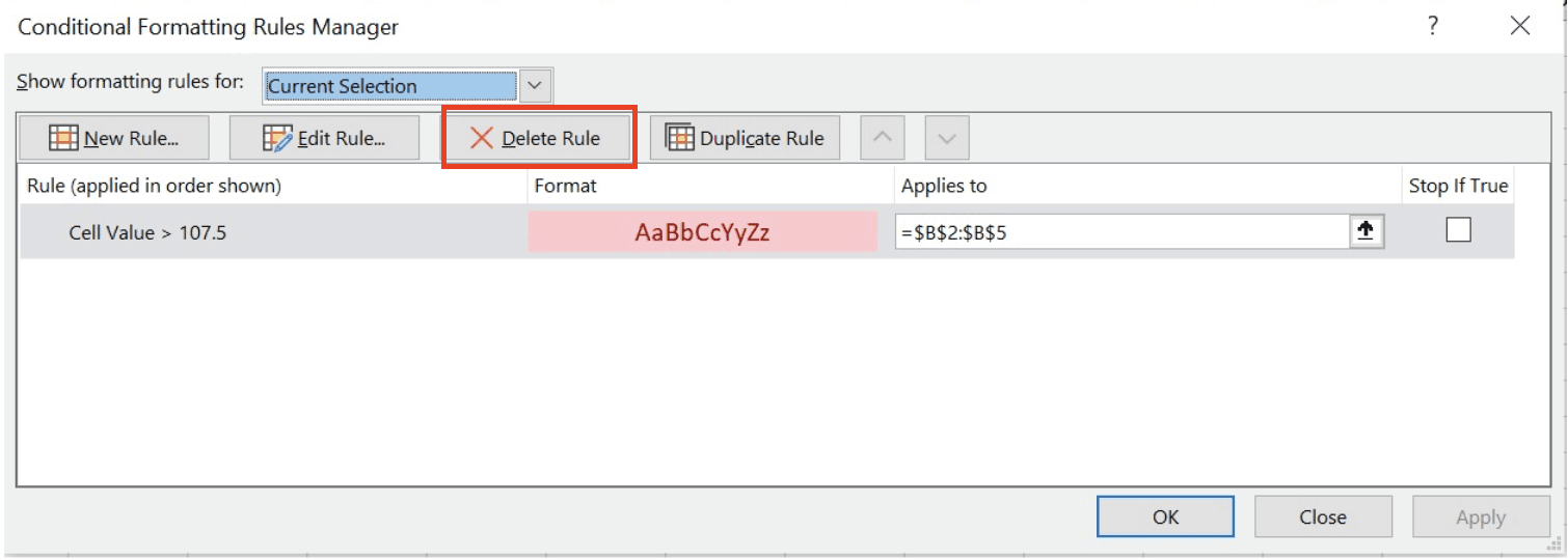 Note: If you want to remove a conditional formatting from a part of the range defined, we recommend you change the selected field in each rule as it allows the rule to be applied to the rest of the area.