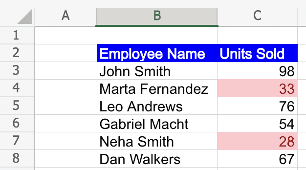 Suppose you are manager for a sales team and wish to track the number of units sold by each of your team members. An easy way to highlight those who sold less than 35 units is to use Conditional Formatting. The spreadsheet has the units sold by employees in column C.